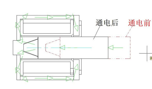 推拉式電磁鐵中間的滑動鐵芯,線圈通電后產生磁場,磁場將鐵芯磁化,鐵芯形成疊加磁場,磁力線由一極向另一極運動時產生力,鐵芯的一端可以帶動一個物體做位移運動,進而實現一個功能動作。